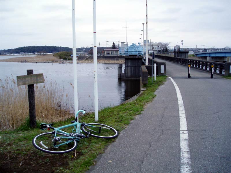 柏ふるさと大橋から戻ってくるのが向かい風で 鼻水は出るわ、涙は出るわで大変だった。しばし休憩。サングラスを忘れてしまったのが痛かった。この後今度は東の端「手賀曙 橋」まで行く。