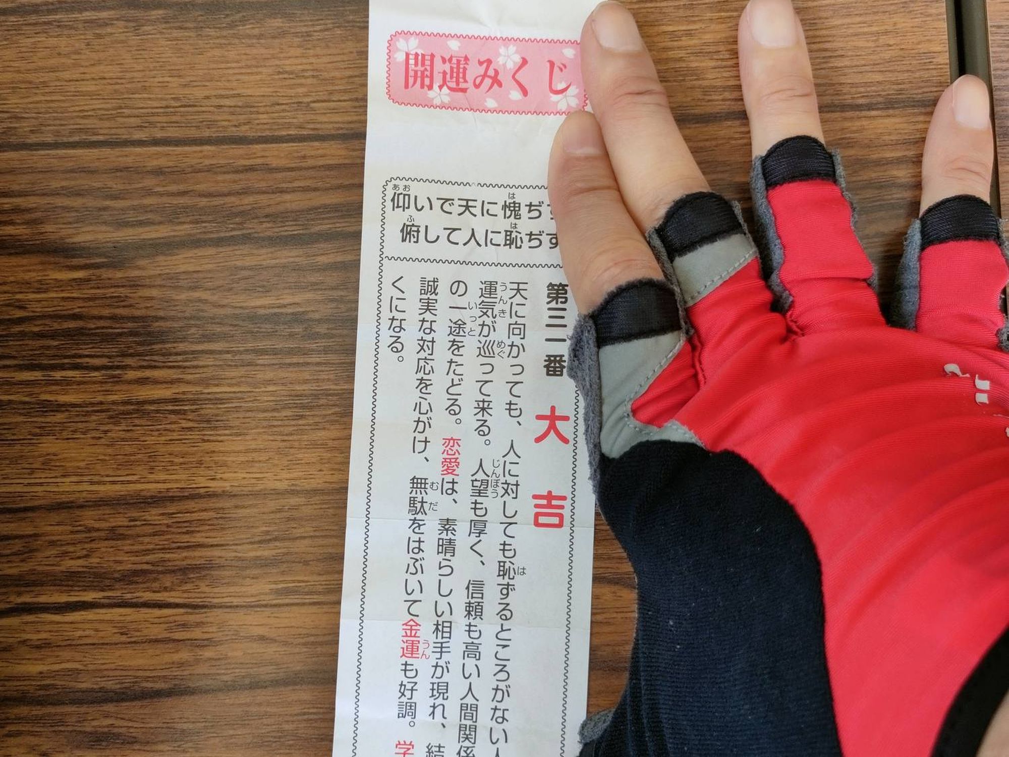 結果なんと「大吉」!書いている内容読んだが、「仰いで天に愧ぢず、附して人に恥ぢず」とある。「自己を反省してみて少しもやましい所のない、公明正大な心」という意味のようだ。
