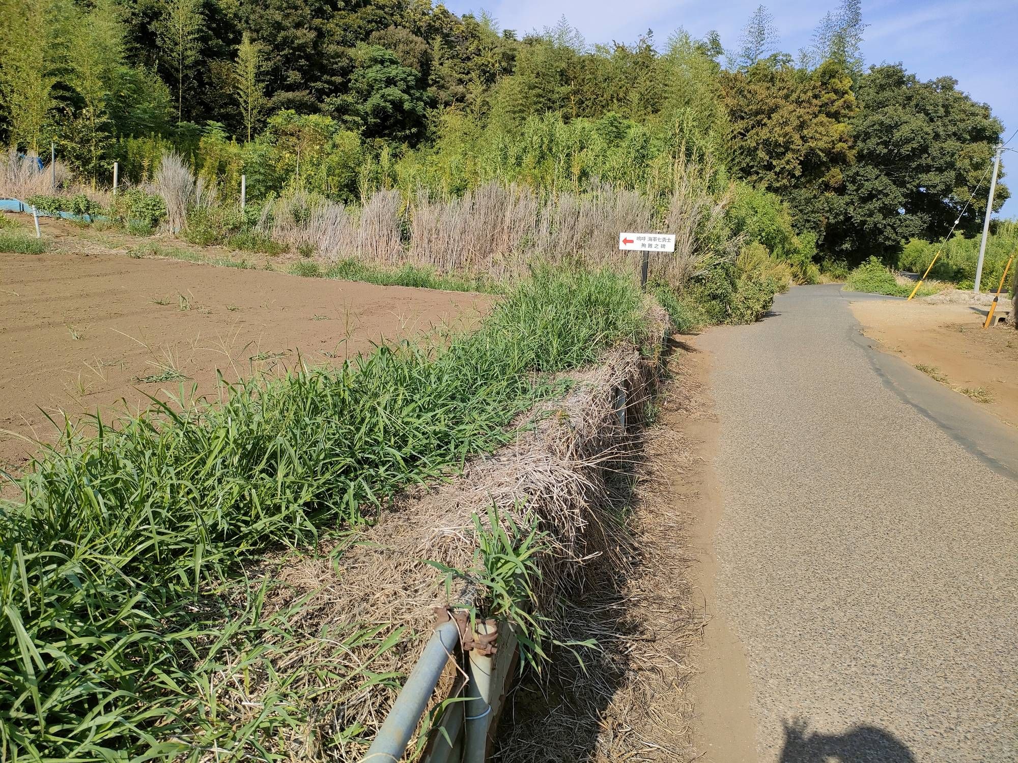 しかし、程なく木々が見えてきて畑らしきものが見えてきた。この辺りだと思ったら標識があった。