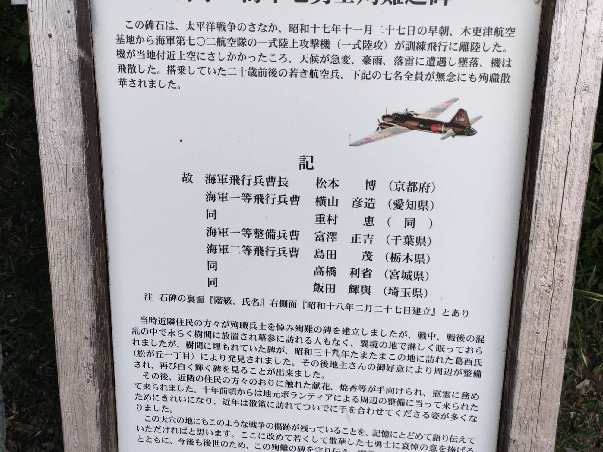 昭和17年11月に木更津空港基地から海軍第702航空隊の一式陸上攻撃機が訓練飛行に飛びたったのだが、この機が丁度この場所の上空で、天候が急変し落雷に遭遇し墜落した。